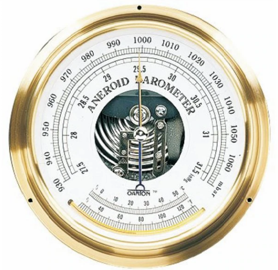 A barometer is a scientific instrument used to measure atmospheric pressure, also called barometric pressure. The atmosphere is the layers of air wrapped around the Earth. That air has a weight and presses against everything it touches as gravity pulls it to Earth. Barometers measure this pressure.