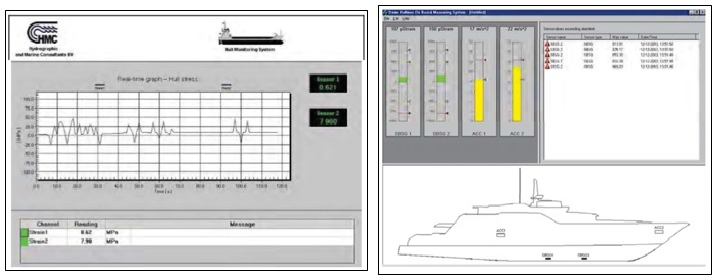 Large tankers, bulk carriers or container vessels, where the hull girder stiff ness is relatively low compared to their size, and which need hull monitoring systems to measure the forces, motions and resulting stresses caused by the sea state. The system includes various sensors, such as long-base strain gauges, rosette gauges and trio-axial accelerometers to monitor hull girder deck stresses and localised stresses on bulkheads, side shell, cross-deck strip and double bottom structure. Real-time data from these sensors is provided for immediate use and for the evaluation of the course and/or speed changes.